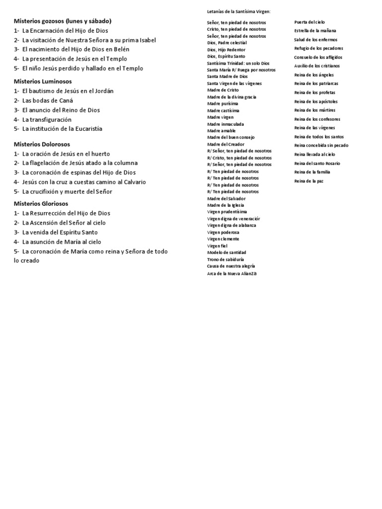 Up to 24 cash back Misterios y letanias del santo rosario pdf Saber como rezar el rosario no sólo implica a aprenderlo de forma automática o de memoria detrás de todo ello hay mucho. 57 7 Las promesas de la Virgen a los que recen el Santo Rosario 58 8 Del papa Pío VI a Juan Pablo II 59 9 Misterios Gozosos. Después del Gloria se añade.